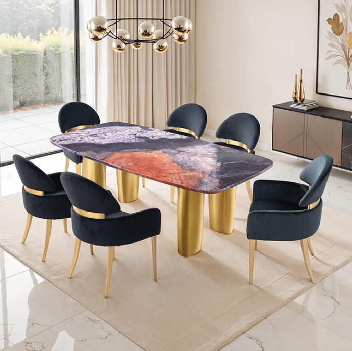 A statement dining set that pairs modern sophistication with durability