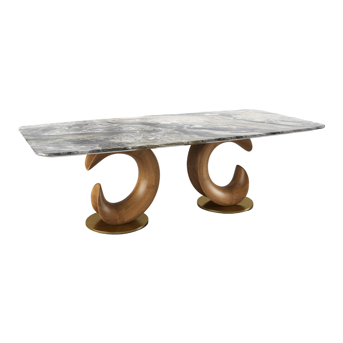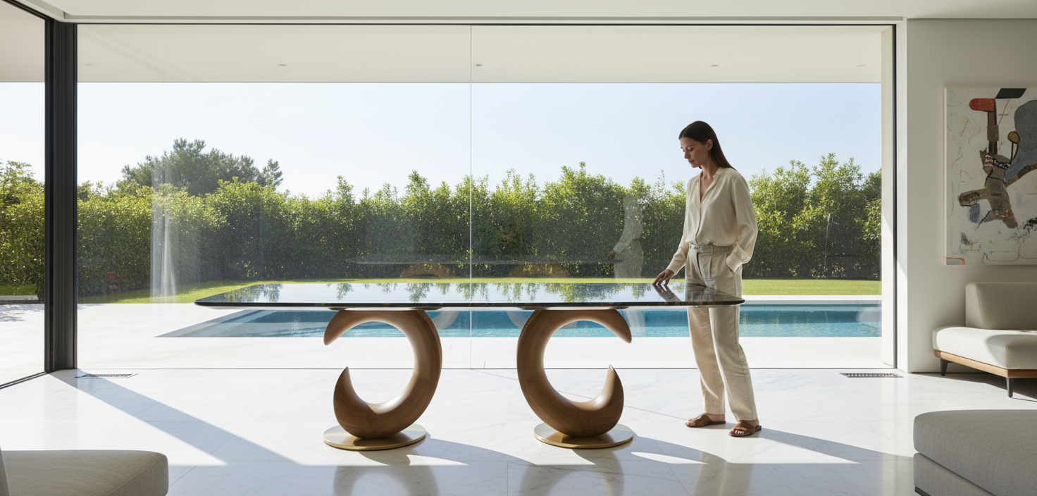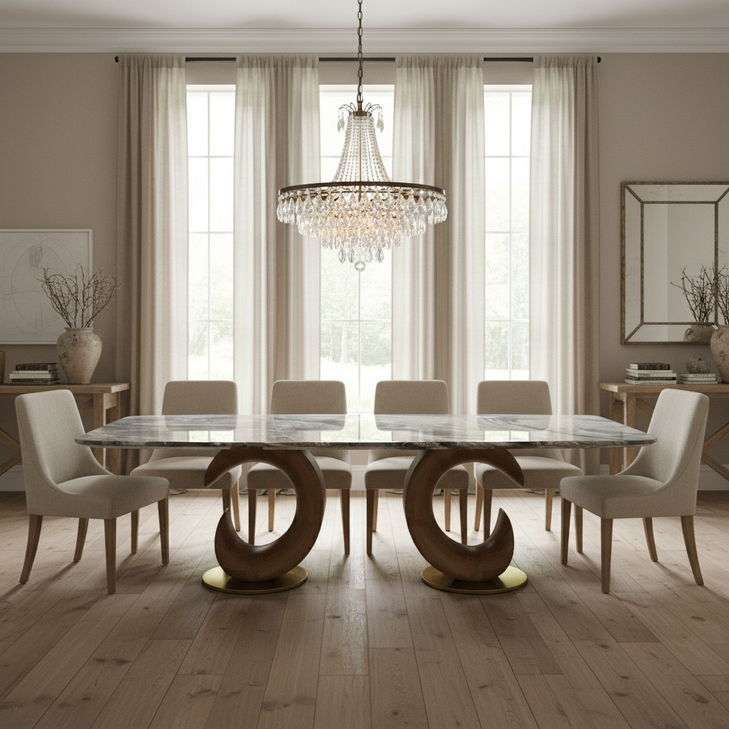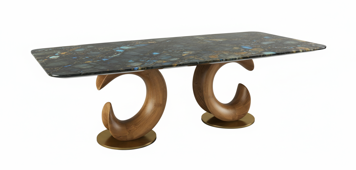 The real showstopper lies beneath—twin sculptural bases inspired by crescent forms, crafted in warm oak wood finish, combining strength and elegance in a balanced silhouette. This architectural foundation brings fluidity and movement to the overall design, transforming your dining area into a curated space of sculptural modernism.