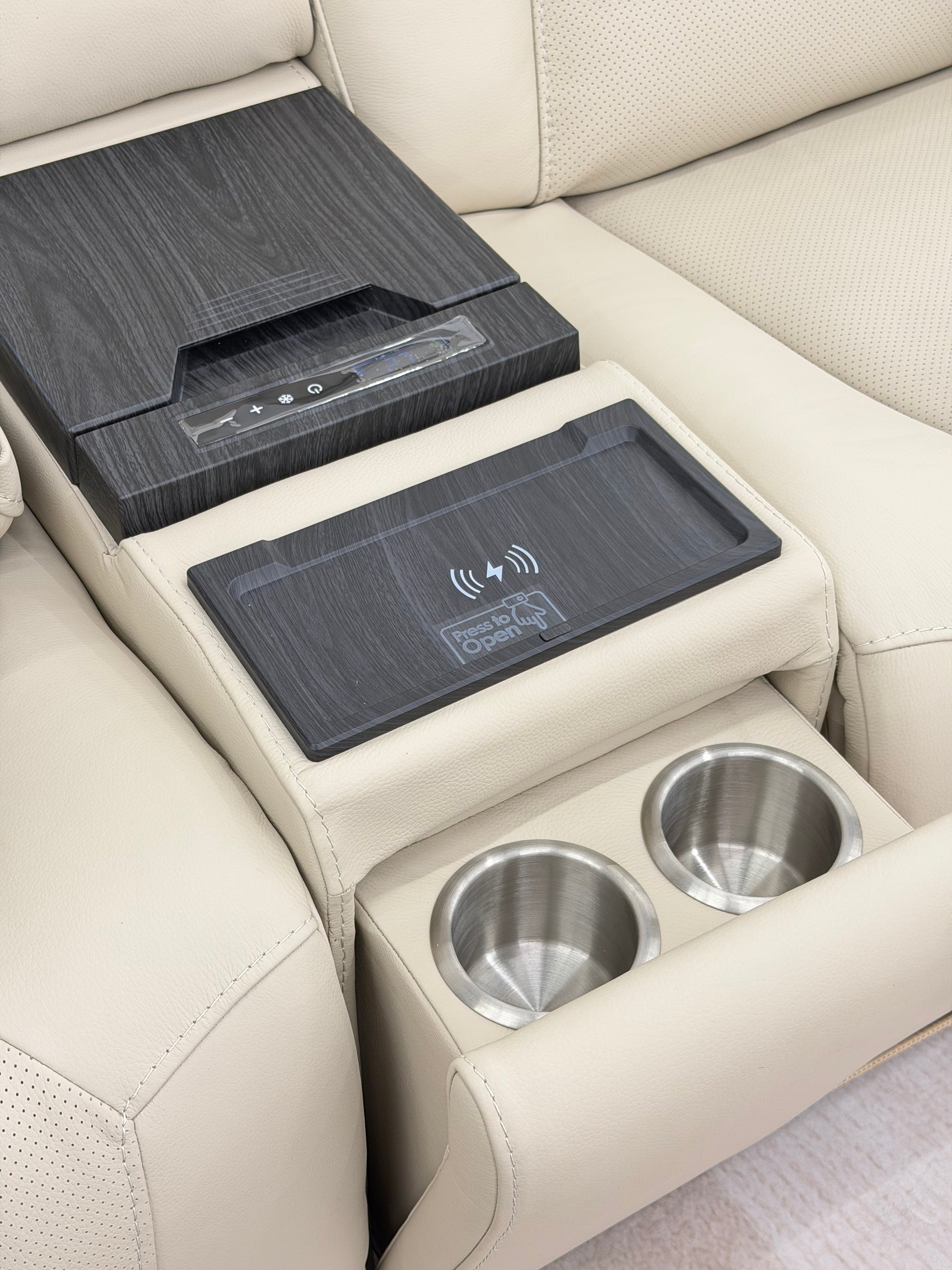The center console is a true technological upgrade — equipped with a built-in cooler, dual wireless chargers, cup holders, and USB-A and USB-C ports for all your devices. The powered console folds down seamlessly, revealing a hidden workspace or entertainment hub when in use, and returns to a sleek, full seat when folded away — maintaining a clean, modern silhouette.