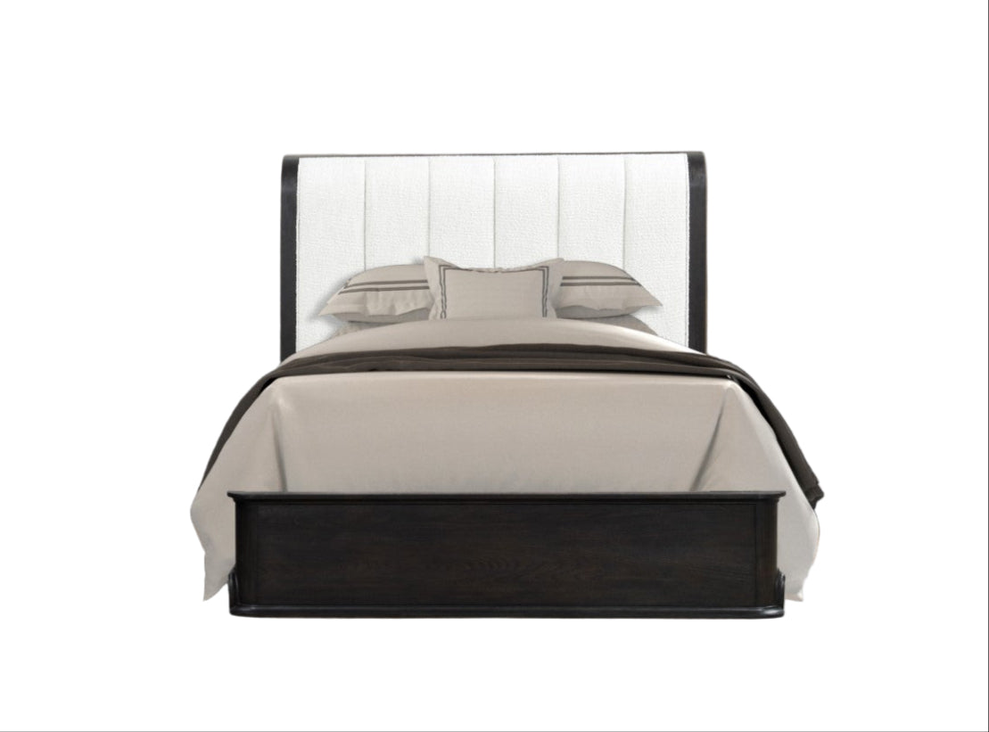 The standout feature is its padded, curved-edge headboard, upholstered in fabric for a sleek yet inviting look. Complementing the bed are premium construction details found throughout the Osterley Collection: felt-lined top drawers, UV-stained lower drawers, and smooth ball-bearing glides with French front & English back craftsmanship.