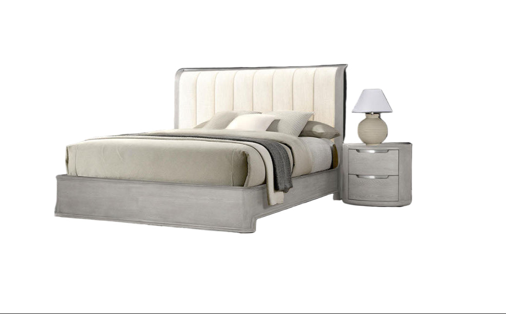The Osterley Bed embodies modern sophistication with its clean lines and luxurious details. Finished in a soft light gray tone, it’s crafted from solid poplar, engineered wood, and fabric, ensuring both durability and refined appeal.