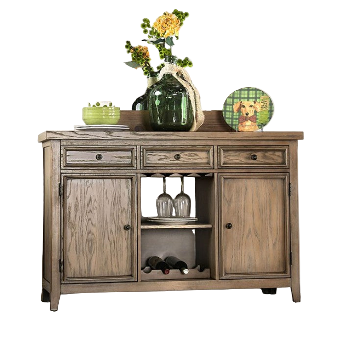 Featuring a built-in wine rack, multiple drawers, and open shelving, it provides generous storage for dinnerware, bottles, and entertaining essentials. Whether in the lighter natural finish for a welcoming farmhouse feel or the deeper walnut tone for a more dramatic presence, the Patience Server completes your dining room with style and ease.