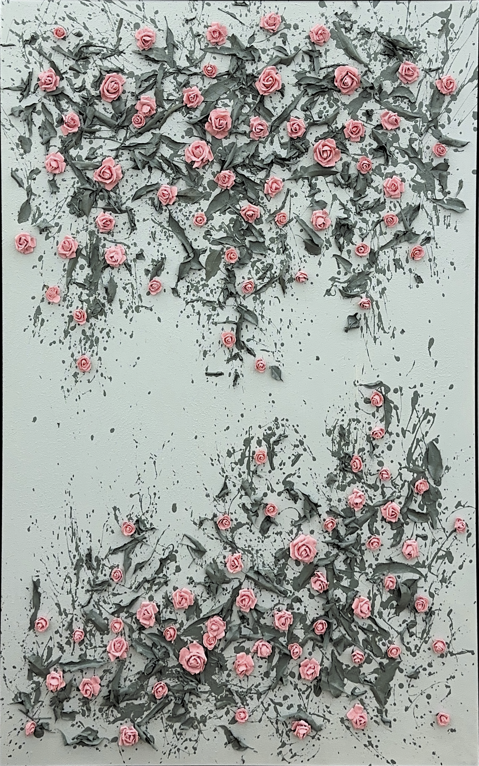 "Petals in Motion" is a captivating mixed-media floral artwork that combines the timeless beauty of roses with the bold energy of abstract expressionism. Handcrafted pink rose sculptures emerge from the canvas, each petal meticulously shaped to create lifelike texture and dimension. These blooms are set against a backdrop of splattered and streaked deep green, evoking the movement of wind through a blooming garden or the spontaneous rhythm of nature itself.