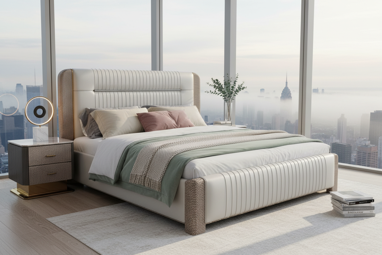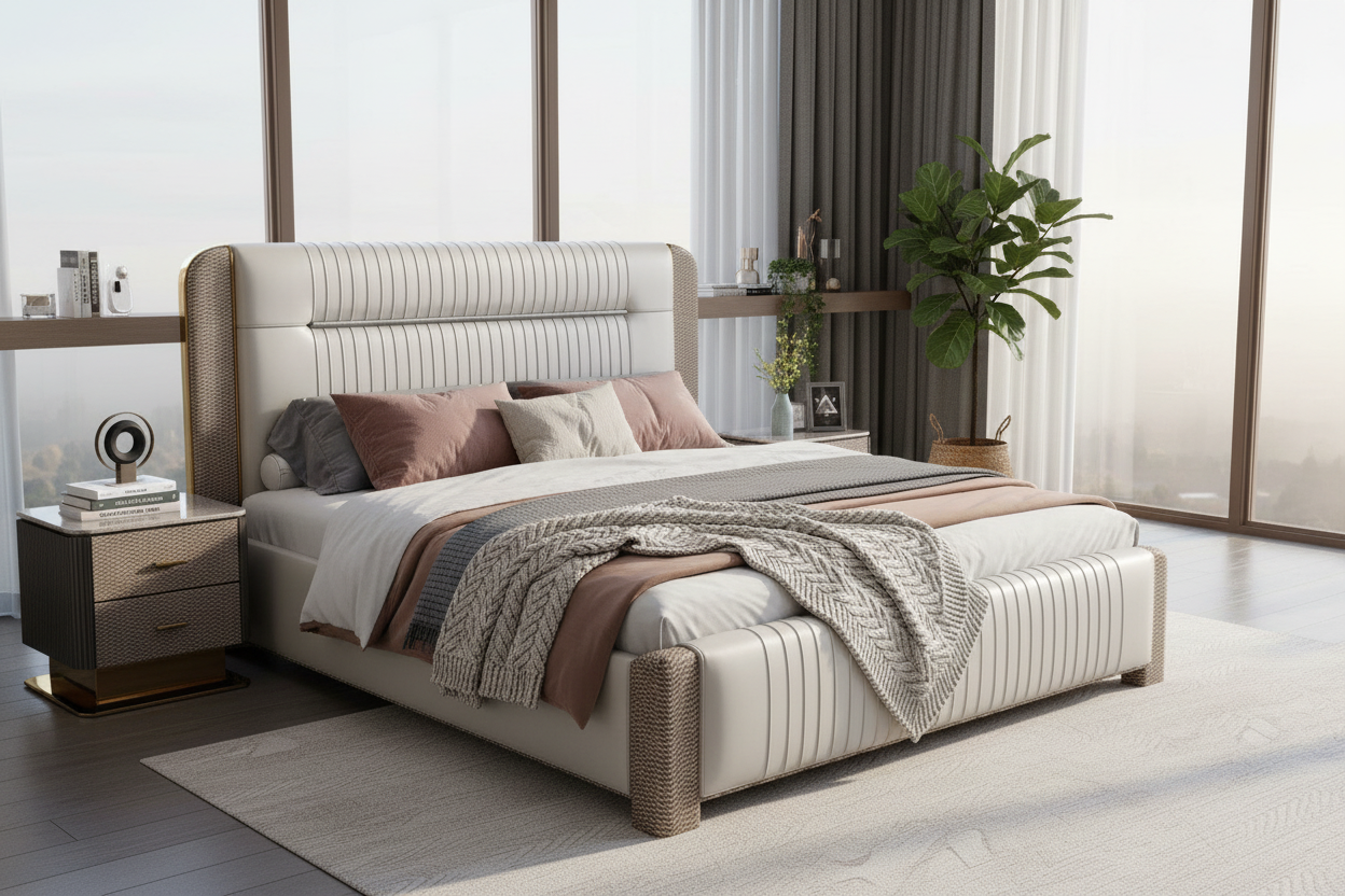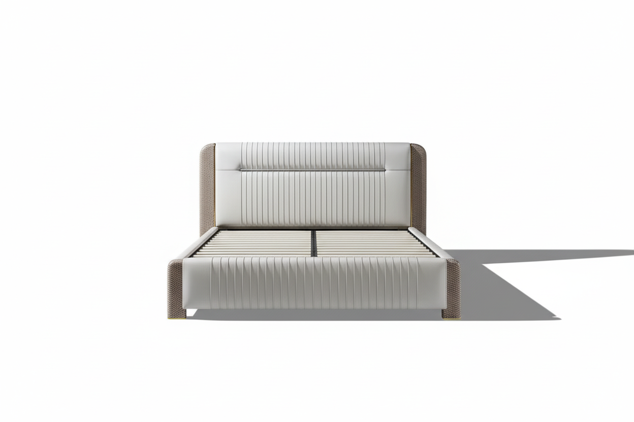 Enhance your bedroom with this sophisticated bed, crafted to bring both style and comfort into modern living spaces. This bed features a tall, elegant headboard upholstered in smooth leather, providing a luxurious touch while the horizontal stitching adds a contemporary appeal. The sides of the headboard and footboard are wrapped in a unique textured pattern that gives the bed a distinct look, seamlessly blending luxury with subtle detail. Finished with gold-tone accents, this bed brings a touch of refined elegance, making it a striking centerpiece for any upscale bedroom.