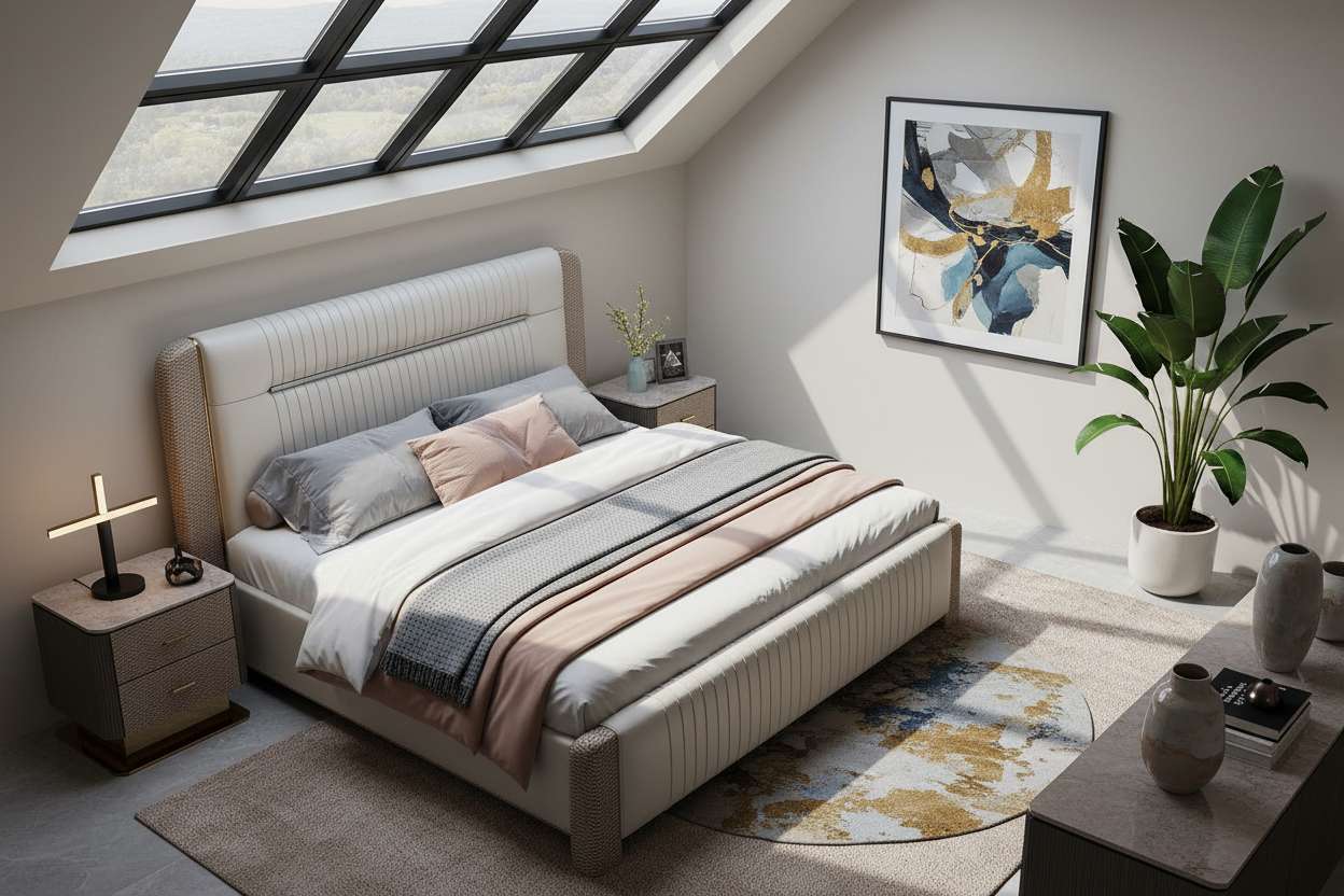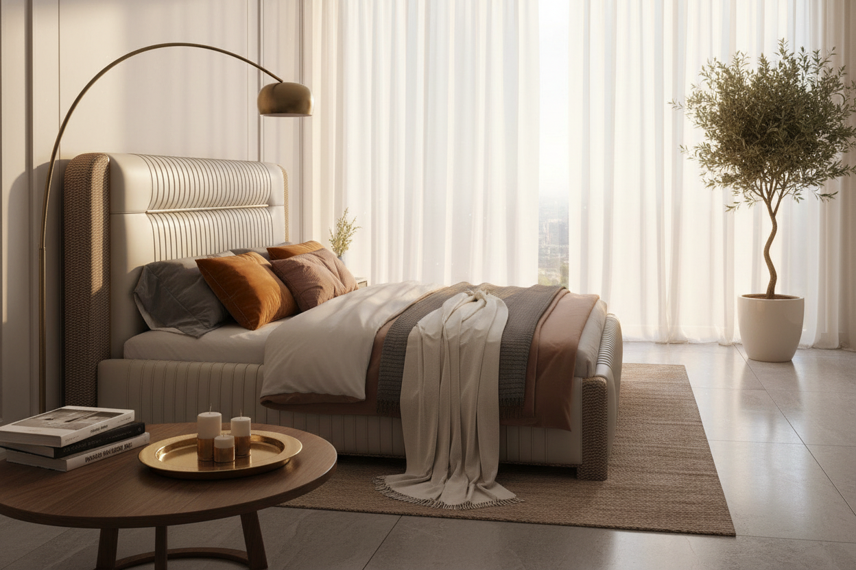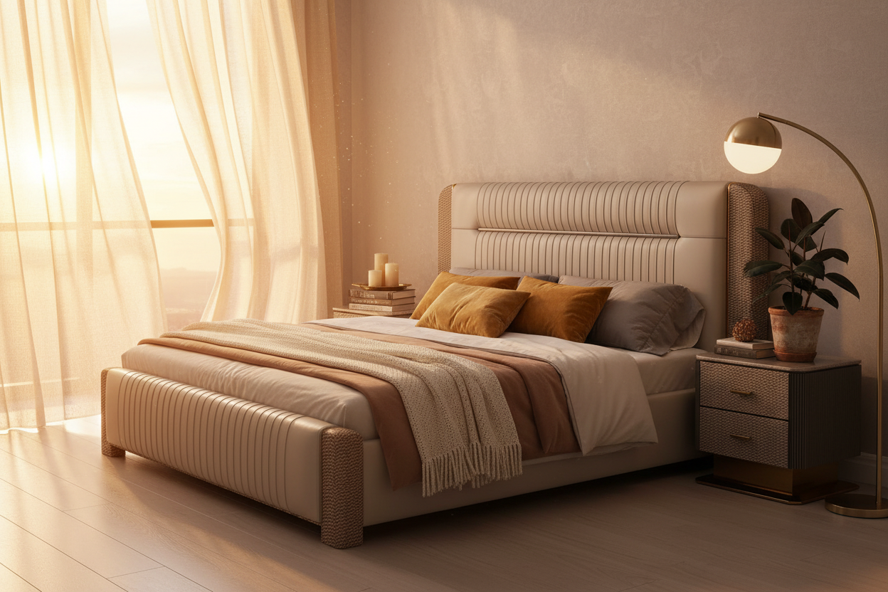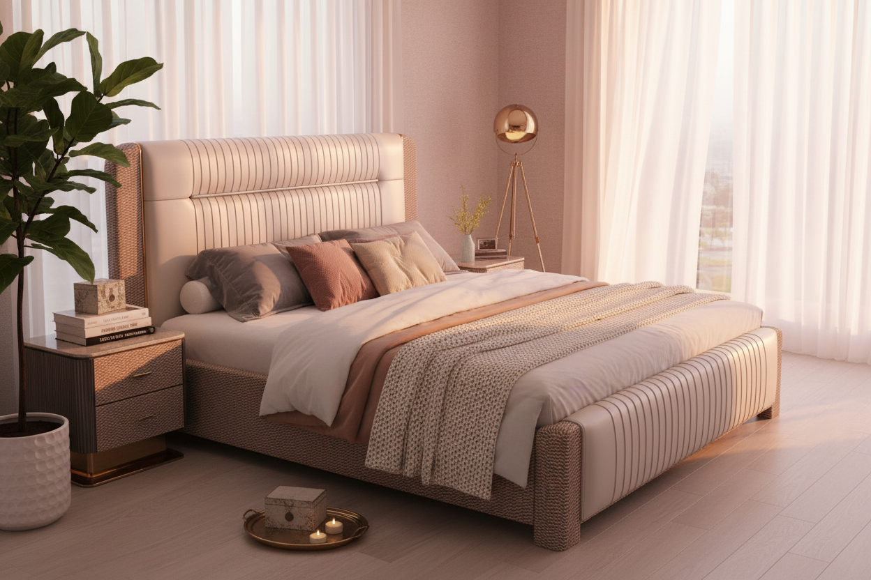 Enhance your bedroom with this sophisticated bed, crafted to bring both style and comfort into modern living spaces. This bed features a tall, elegant headboard upholstered in smooth leather, providing a luxurious touch while the horizontal stitching adds a contemporary appeal. The sides of the headboard and footboard are wrapped in a unique textured pattern that gives the bed a distinct look, seamlessly blending luxury with subtle detail. Finished with gold-tone accents, this bed brings a touch of refined elegance, making it a striking centerpiece for any upscale bedroom.