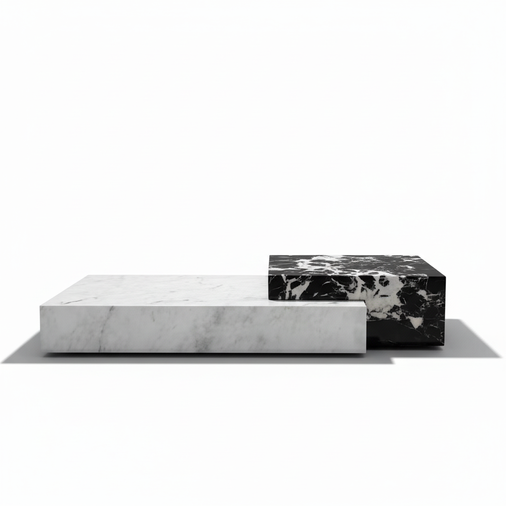 Elevate your living space with the timeless elegance of our Royal Marble Coffee Table. This statement piece features a bold, asymmetrical design crafted from two luxurious marble blocks. One side boasts rich black marble with striking white veining, while the other contrasts beautifully with pristine white marble accented by subtle grey patterns and topped with a sleek, reflective glass surface.
