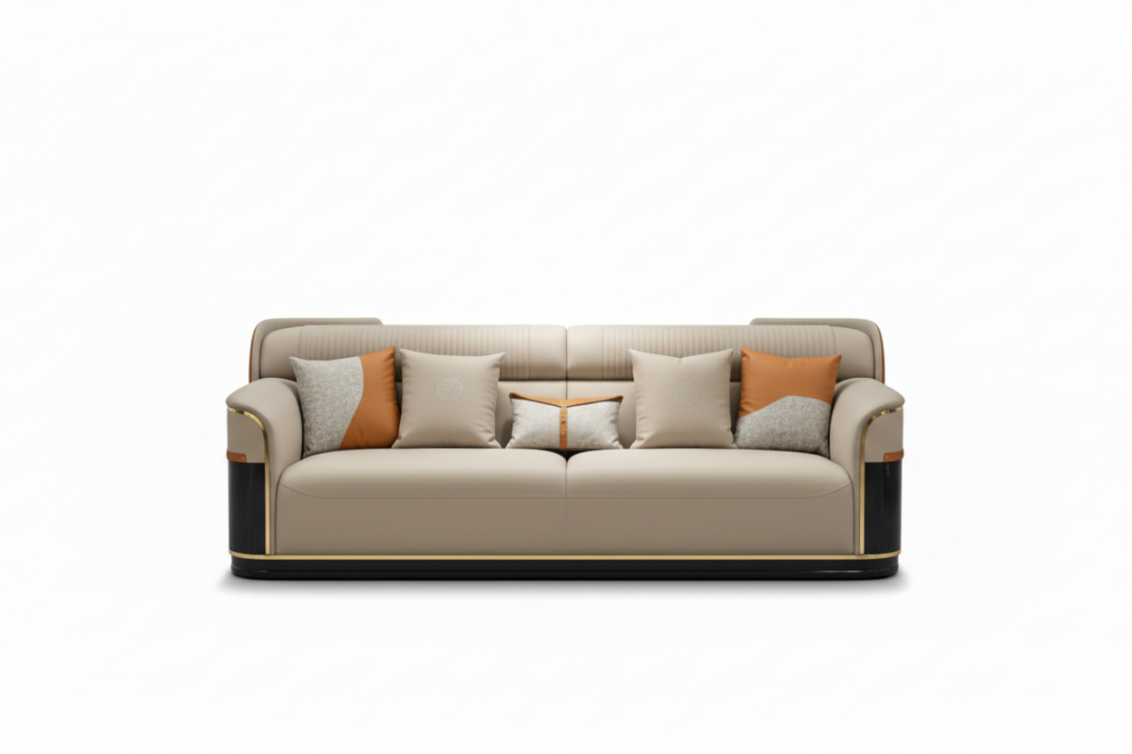 The Royale Luxe Sofa Set is the epitome of refined elegance, merging modern design with luxurious comfort. Upholstered in premium beige leather, this sofa set features clean lines accented by subtle black and orange trim, adding a sophisticated touch to any living space. The set includes medium firm, supportive cushions for a relaxing seating experience and is paired beautifully with a matching marble-top coffee table that enhances the luxurious ambiance. Ideal for upscale living rooms, the Royale Luxe Sofa Set seamlessly combines style and functionality, making it a stunning addition to contemporary interiors.