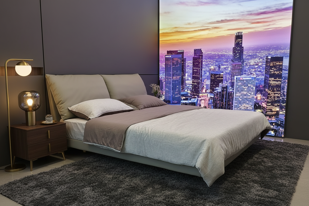 Inspired by cityscapes, this bed features a sleek, minimalist frame complemented by a padded headboard for a soft yet structured aesthetic. -