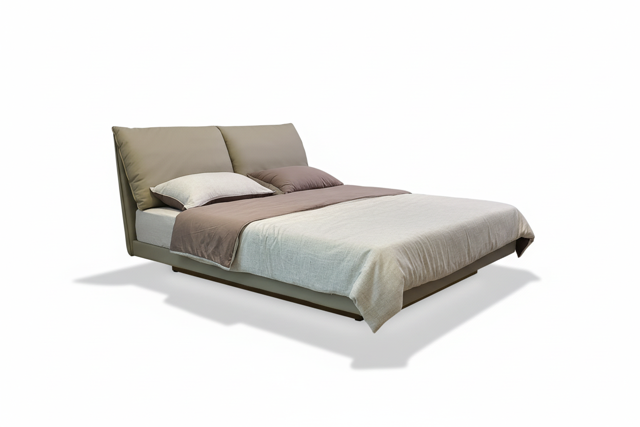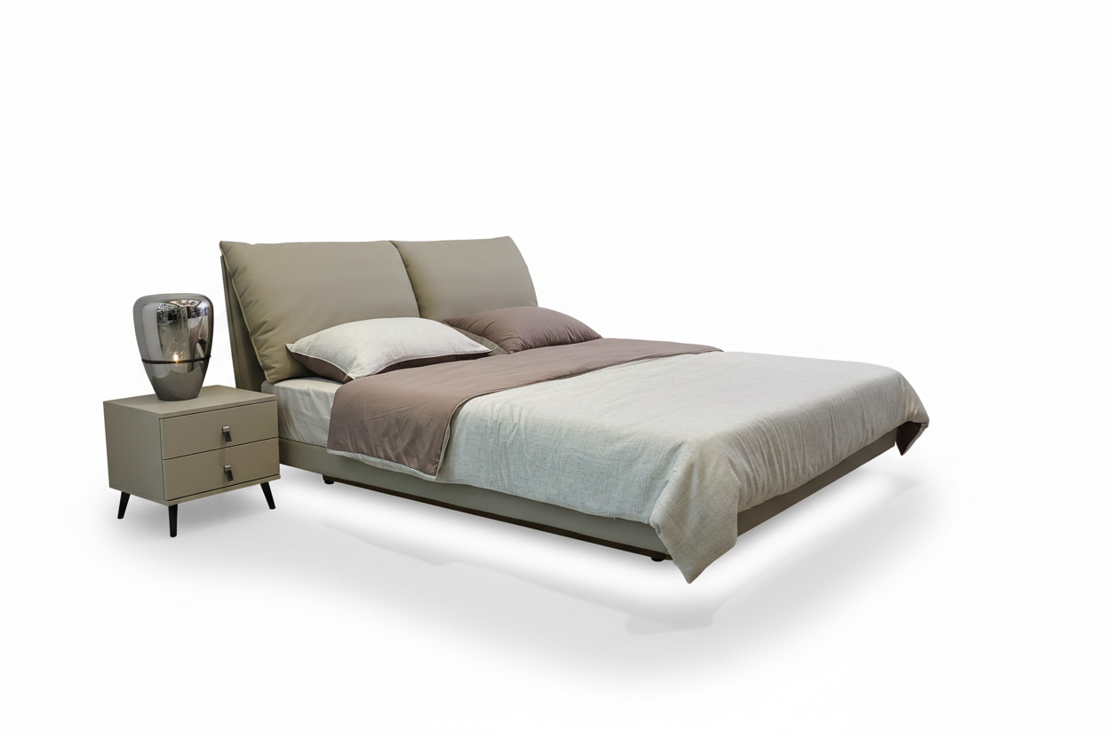 Wrapped in smooth, taupe eco-leather, the bed exudes sophistication while ensuring durability and easy maintenance. -