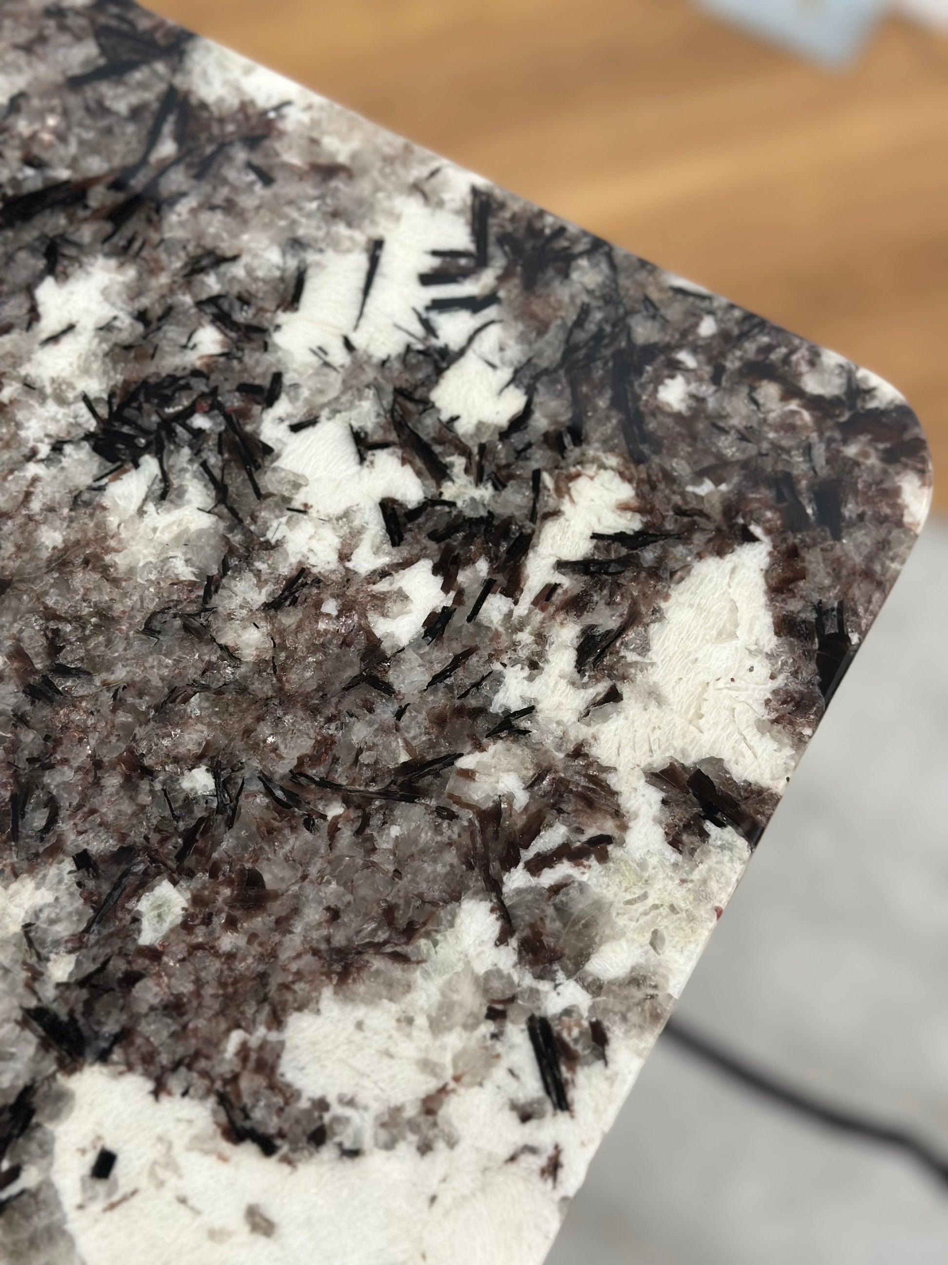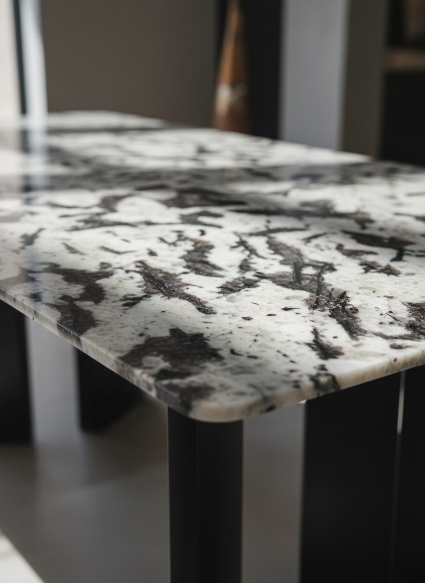 Premium Snow Mountain Quartzite Marble – Naturally durable and rich in character, each tabletop features unique veining and cool-toned elegance that makes every piece one of a kind.