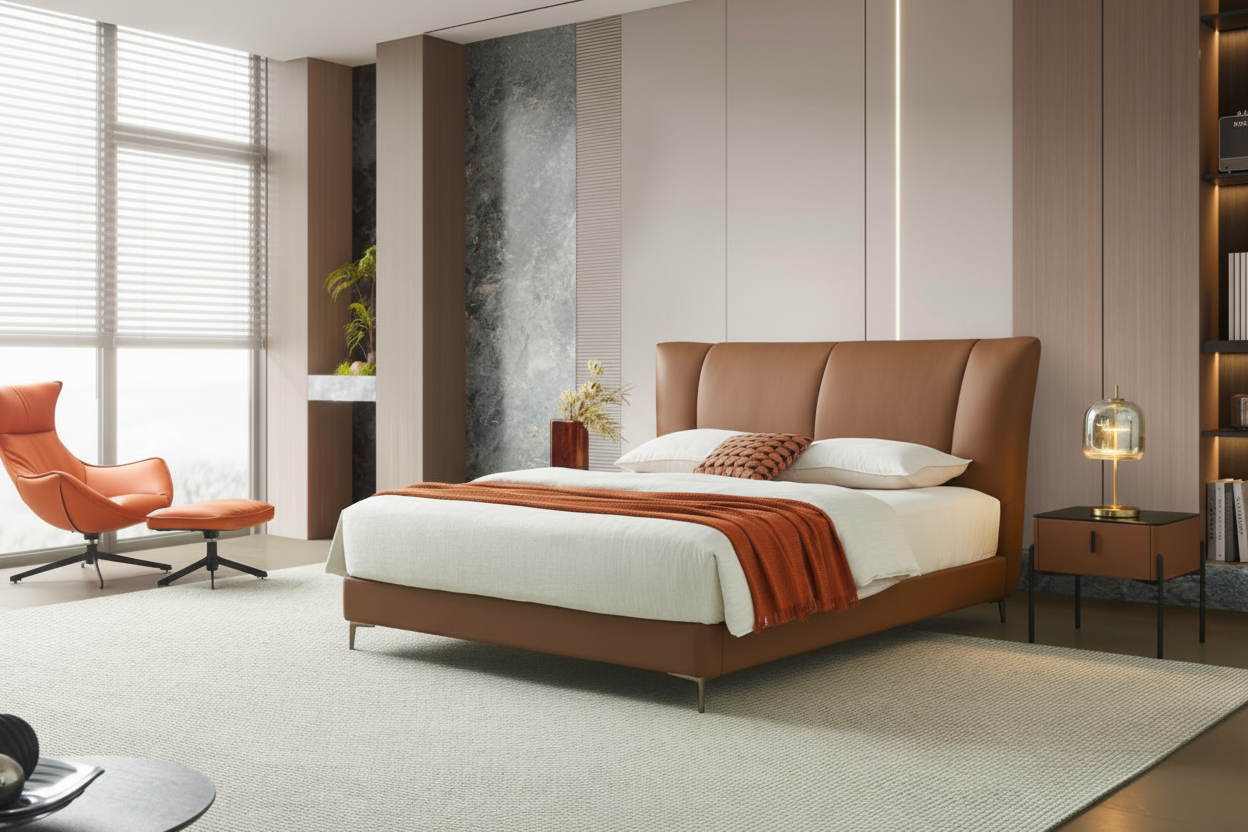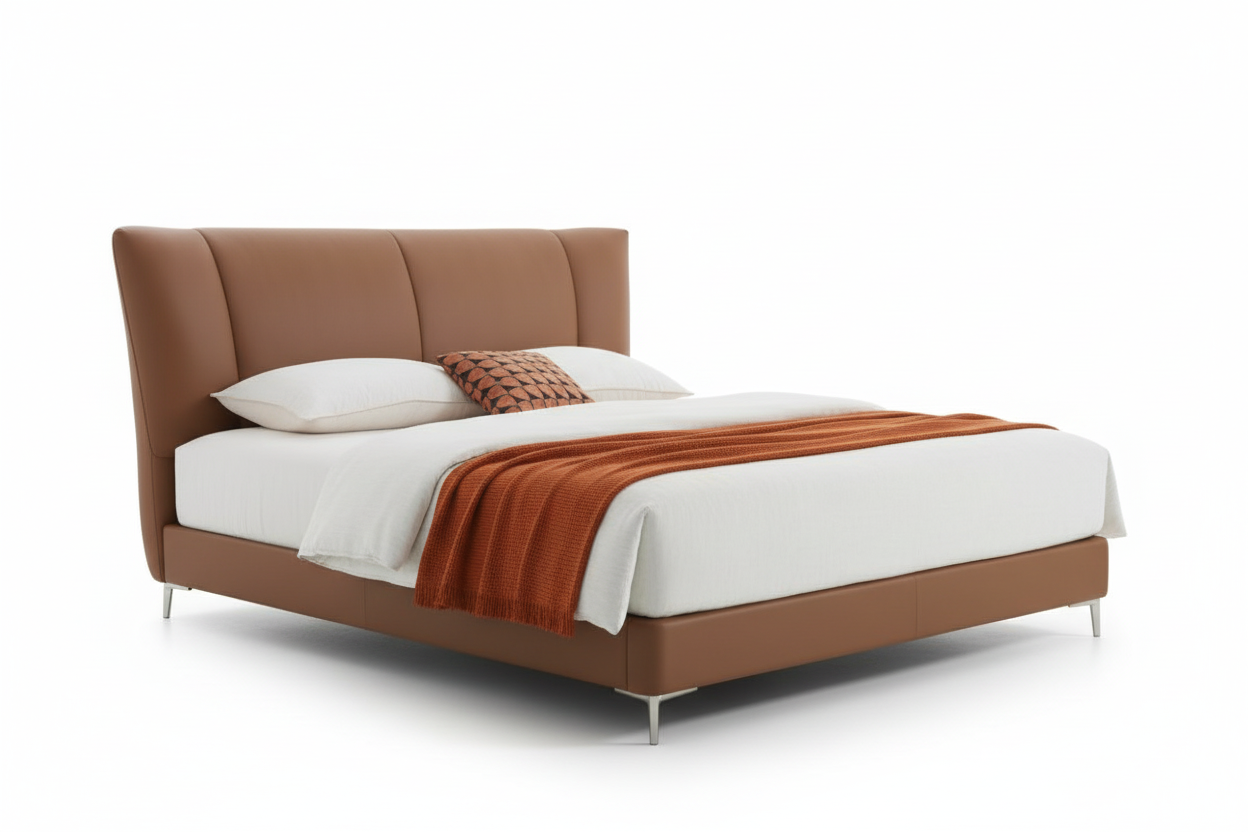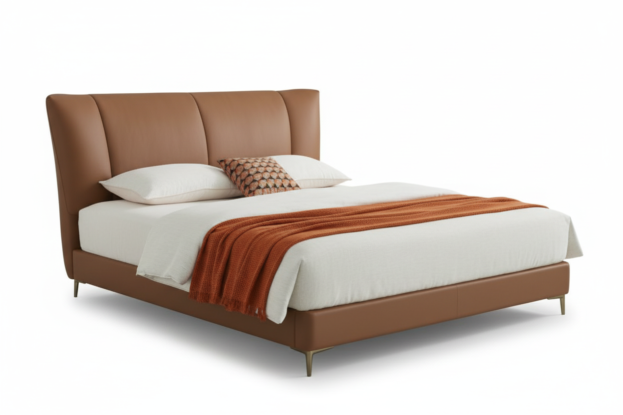 Elevate your bedroom with the Solvan Leather Crown Bed, a striking fusion of luxury and modern design. Upholstered in rich, supple leather, this bed features a sculptural wingback headboard that offers both an elegant aesthetic and exceptional support. The sleek, elevated frame enhances its refined look, while the high-quality craftsmanship ensures long-lasting durability. Designed for those who seek sophistication without compromising on comfort, the Solvan Leather Crown Bed is the perfect statement piece for a stylish, upscale retreat.