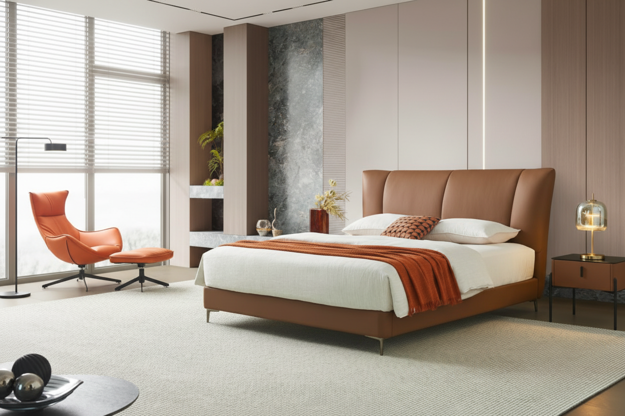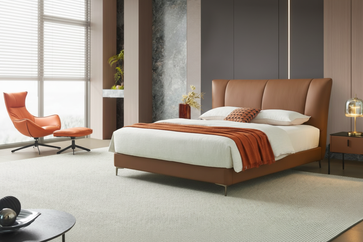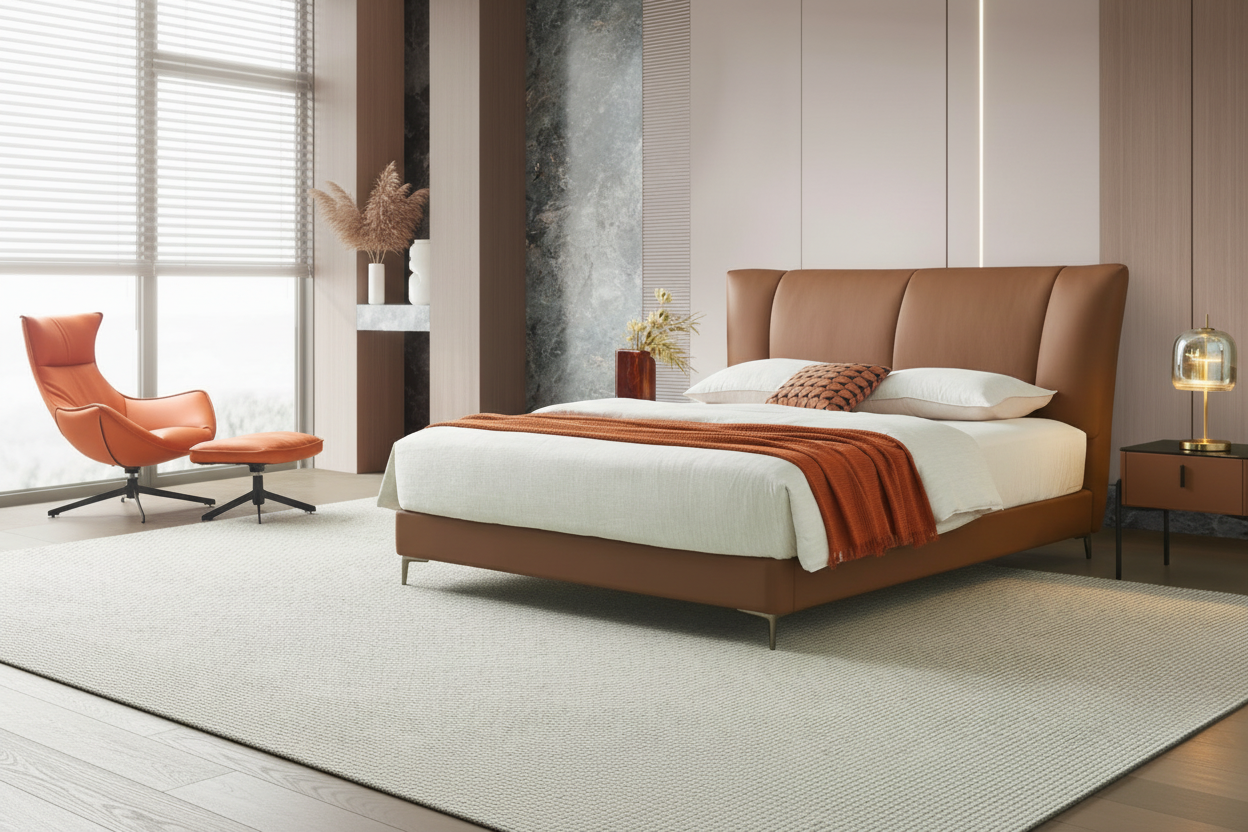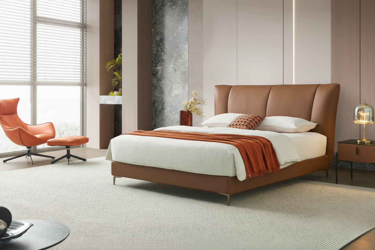 Elevate your bedroom with the Solvan Leather Crown Bed, a striking fusion of luxury and modern design. Upholstered in rich, supple leather, this bed features a sculptural wingback headboard that offers both an elegant aesthetic and exceptional support. The sleek, elevated frame enhances its refined look, while the high-quality craftsmanship ensures long-lasting durability. Designed for those who seek sophistication without compromising on comfort, the Solvan Leather Crown Bed is the perfect statement piece for a stylish, upscale retreat.