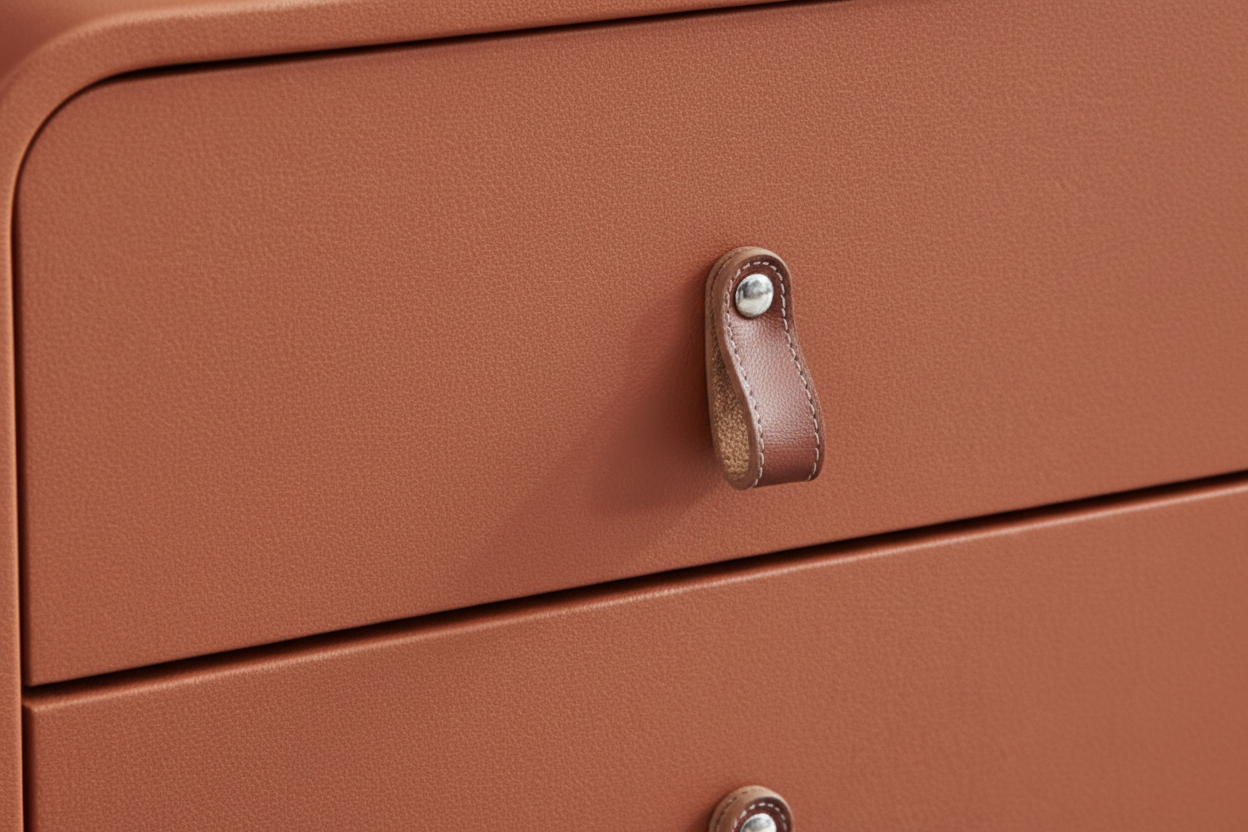 Each drawer is adorned with stylish leather pull handles, adding a refined and unique touch to the overall design. -