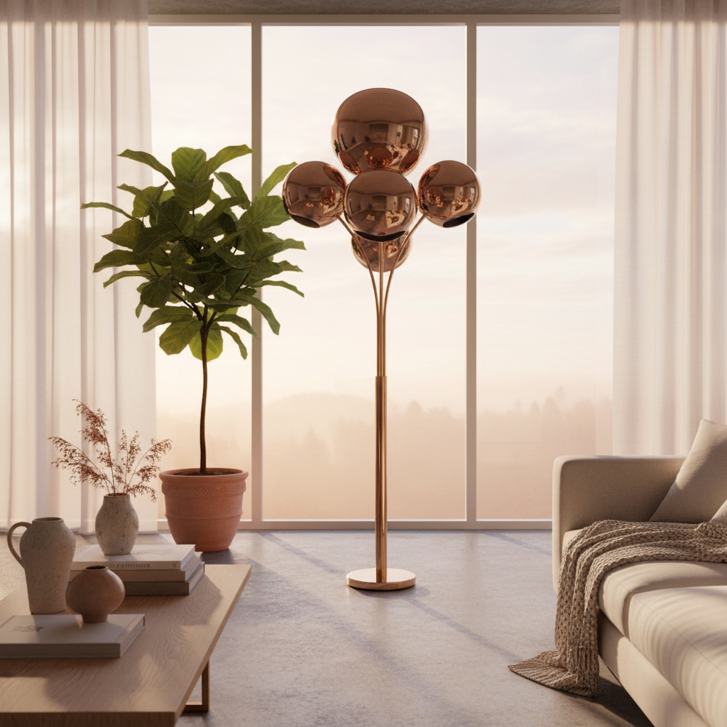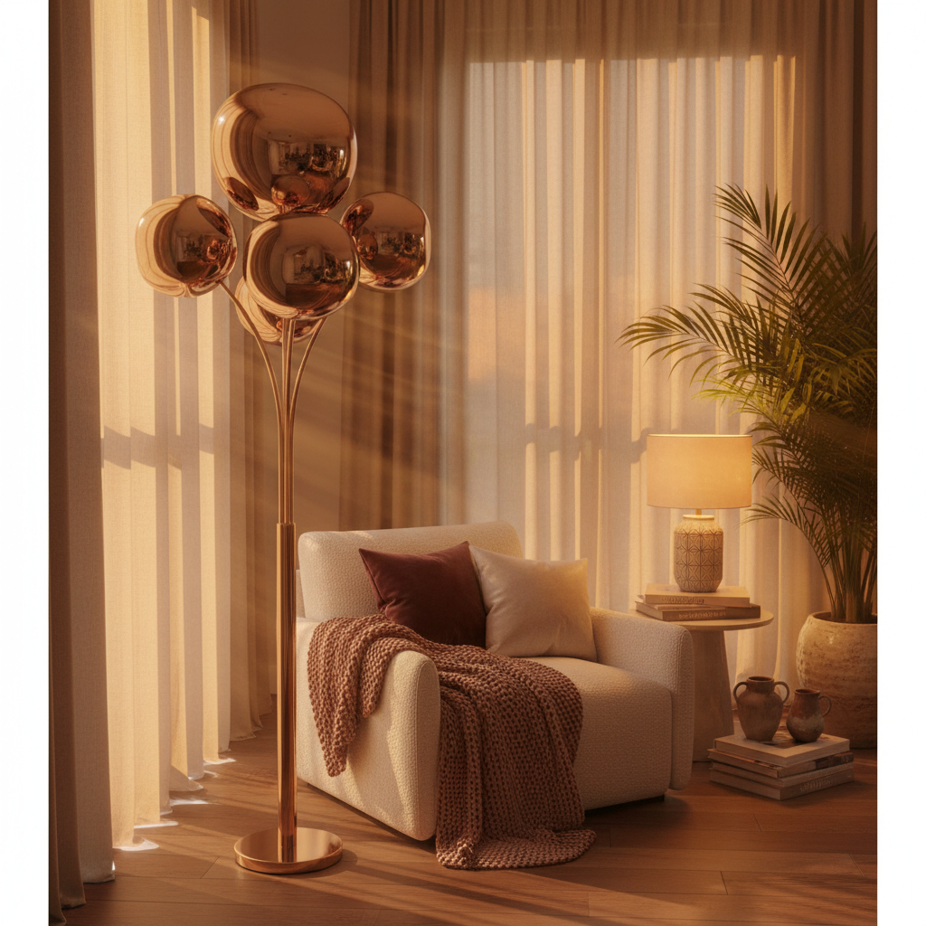 Designed to stand tall like a stylized tree, the lamp’s globe shades create a warm, radiant glow that reflects beautifully off their mirrored surfaces — ideal for illuminating living rooms, lounge areas, or stylish entryways.