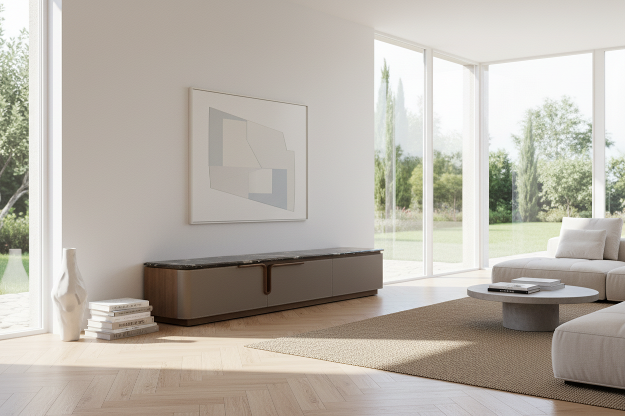 Drawing inspiration from East-meets-West aesthetics, the Monarch combines clean architectural lines with organic marble textures. The minimalist silhouette allows the natural beauty of the materials to take center stage, while the thoughtful proportions ensure it complements both spacious living rooms and intimate entertainment spaces.