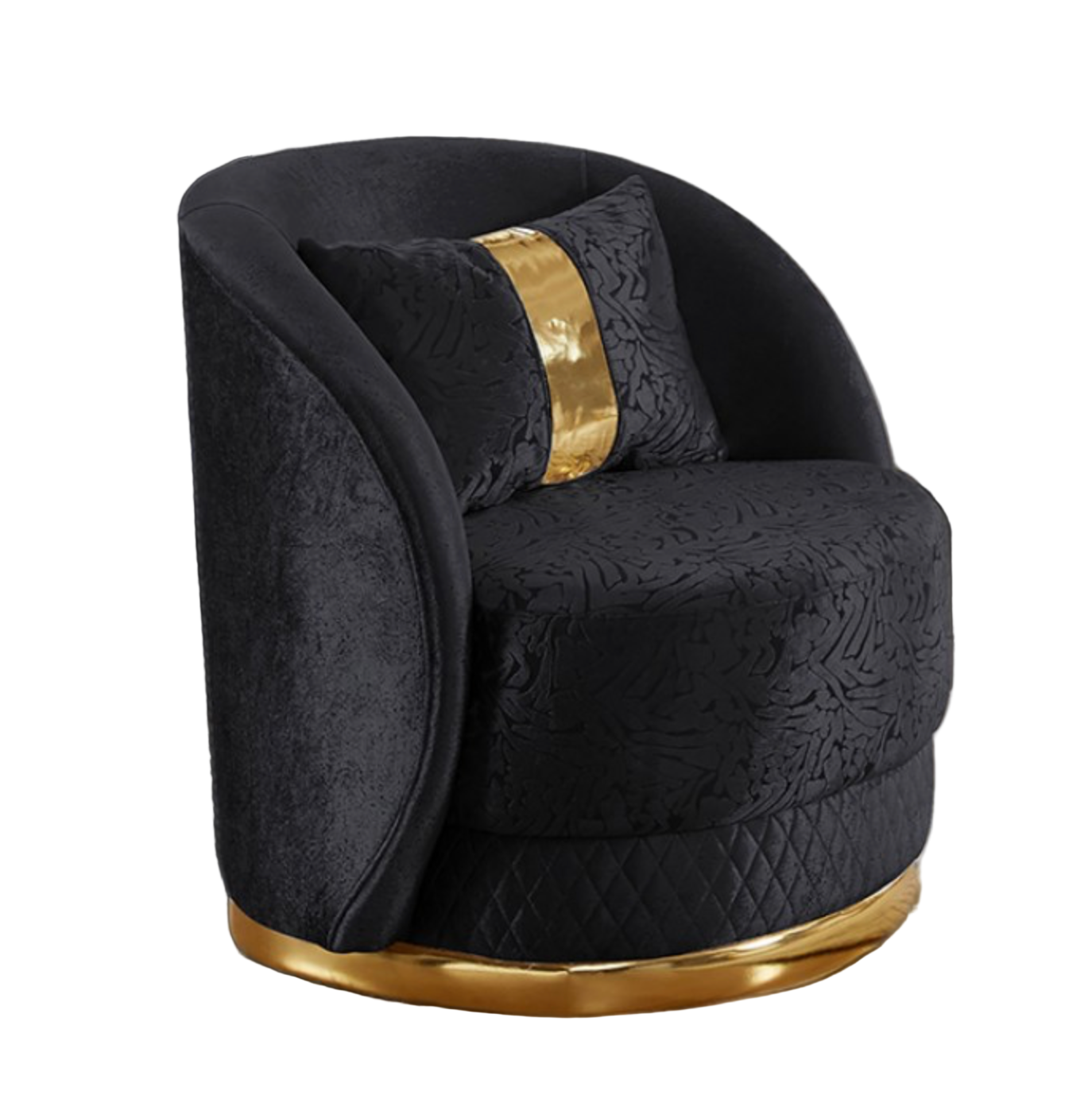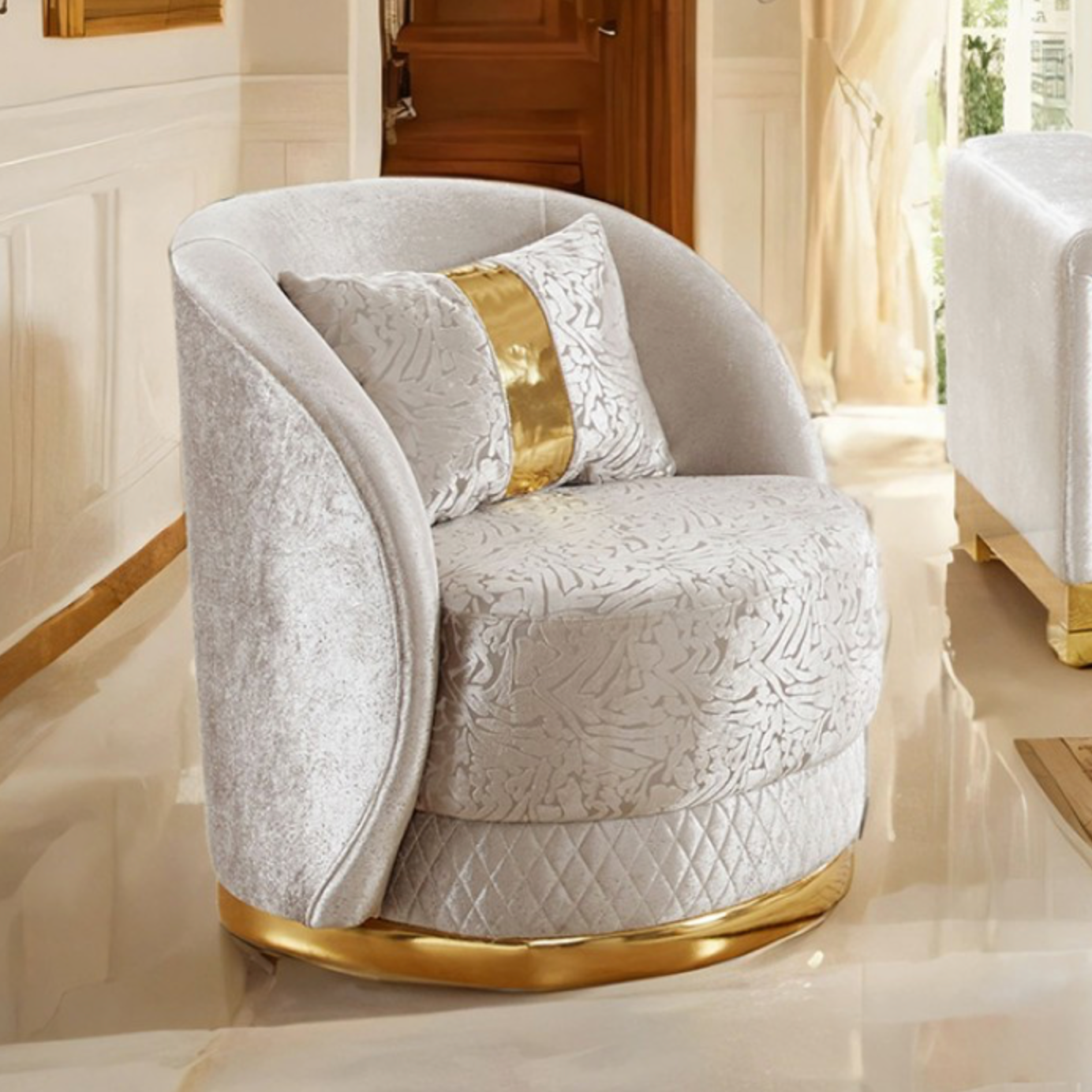 Upholstered in 100% polyester fabric for softness and durability, it features curved track arms, a tight back with attached cushion, and a swivel base with gold-finish trim. Crafted with solid wood, stainless steel, and premium materials, it’s designed to impress and built to last.