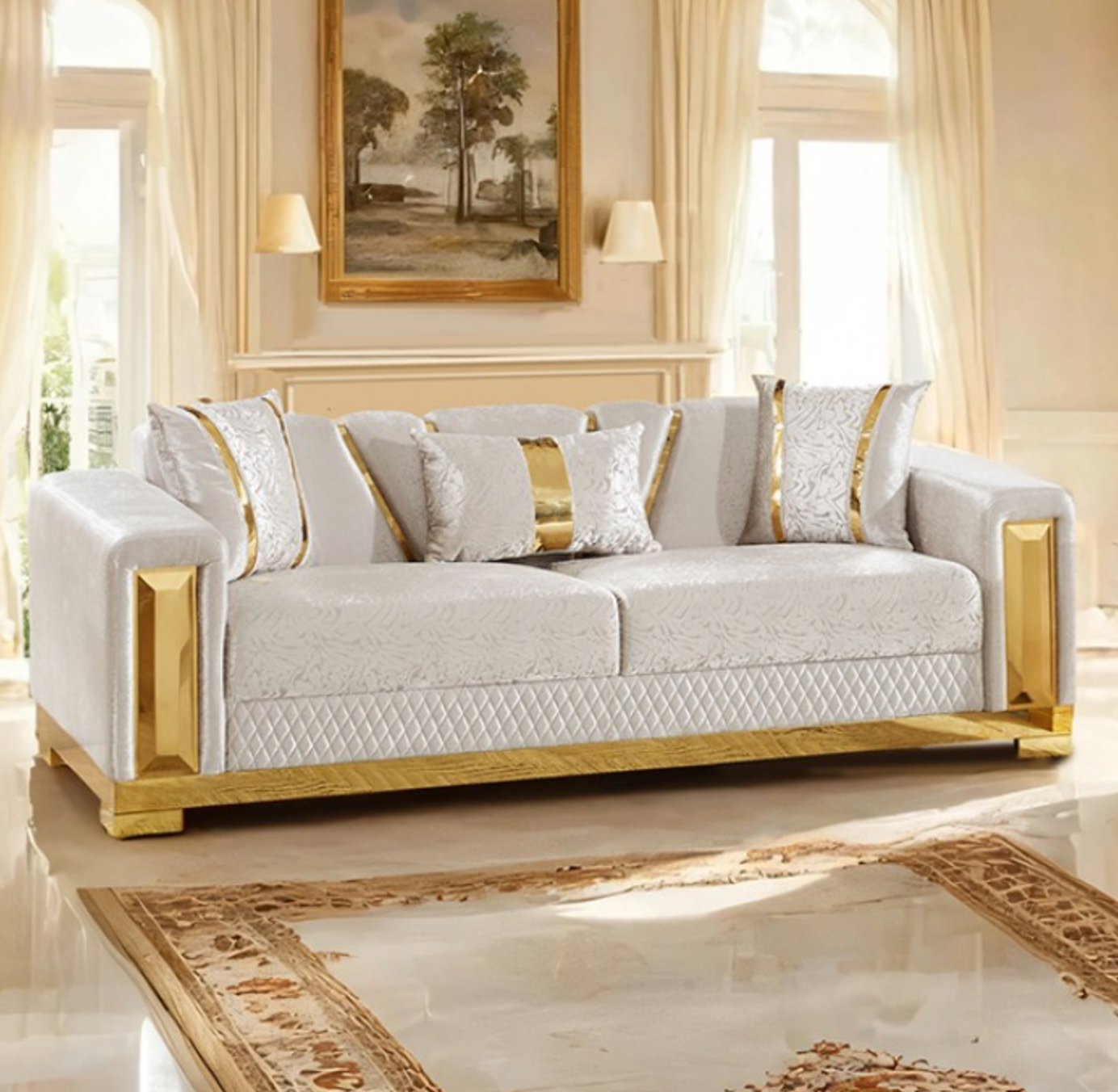 Crafted with 100% polyester fabric, it features a tight backrest, attached box cushions with welt trim, and soft track arms for supportive comfort. The base and accents are finished in polished stainless steel gold, creating a luxurious contrast that elevates any interior. Built with a solid wood frame and premium materials, the Valdosta Sofa combines durability with upscale design.