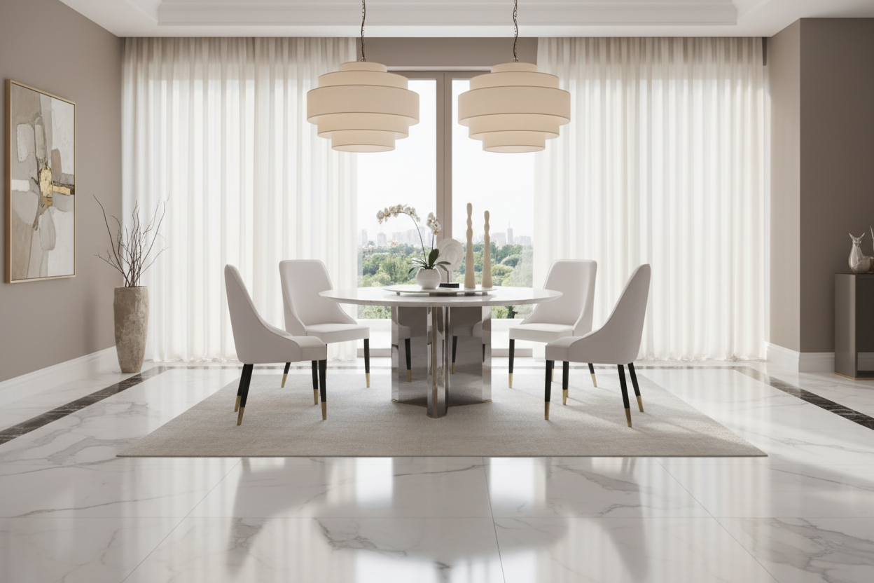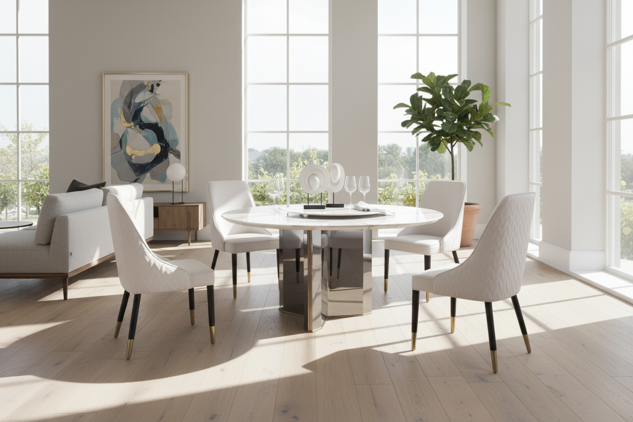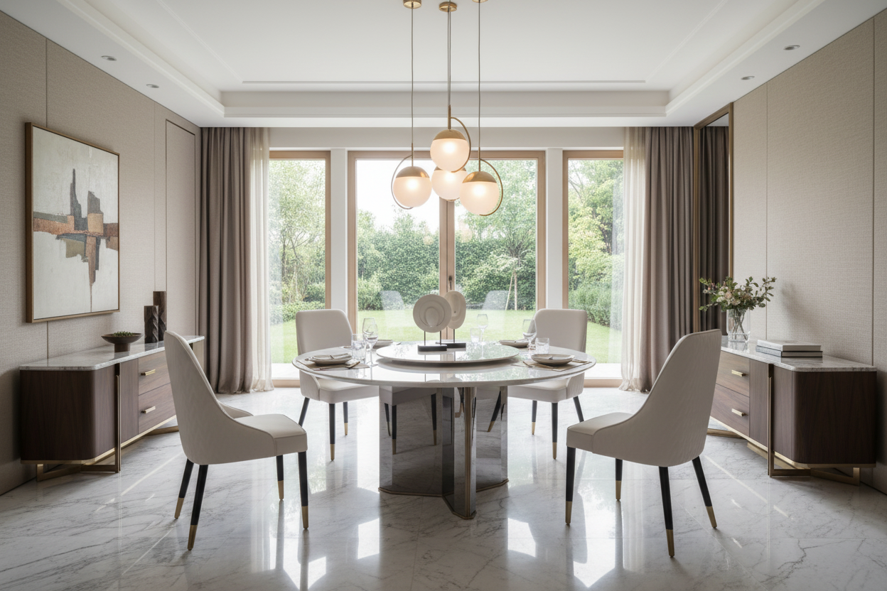 Modern dining rooms, open-concept layouts, or apartments looking for a luxurious round marble dining table that balances beauty and function.