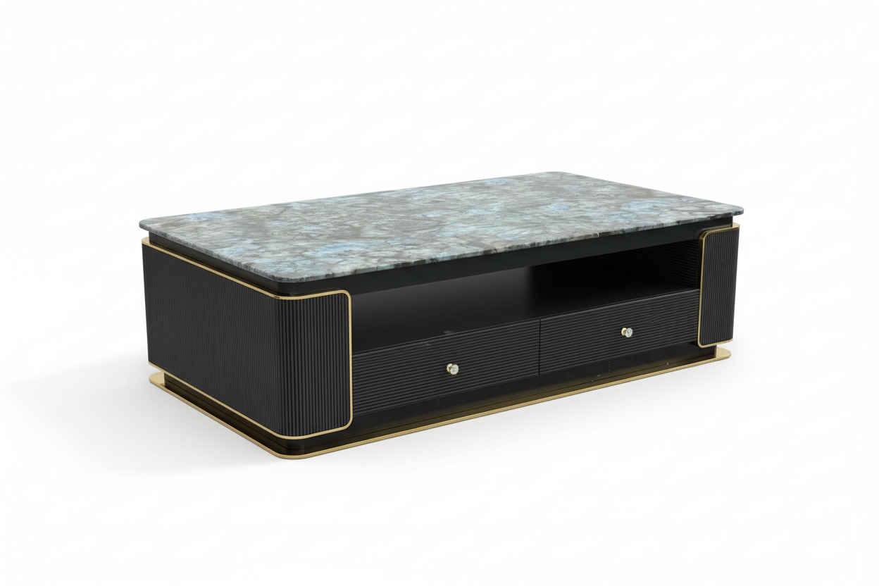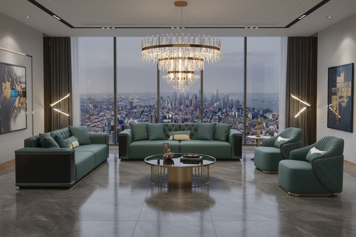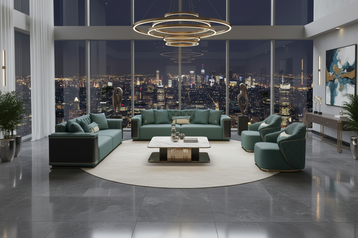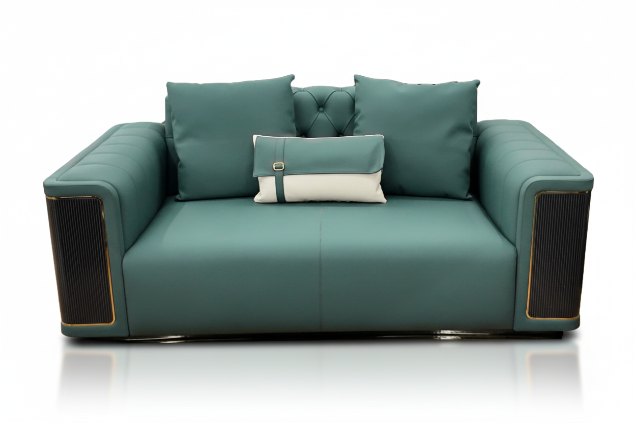 Infuse your living space with refined elegance and contemporary charm with the Verde Majestic Sofa Set. Upholstered in luxurious teal leather, this set features plush cushions and sleek, structured lines, offering both comfort and sophistication. Gold accents along the armrests and base add a touch of opulence, while the intricate side panel detailing on the armchairs introduces a subtle artistic flair. Paired with a striking marble coffee table showcasing deep blue and gray veining, this set is perfect for those looking to create a bold, stylish statement in their home.