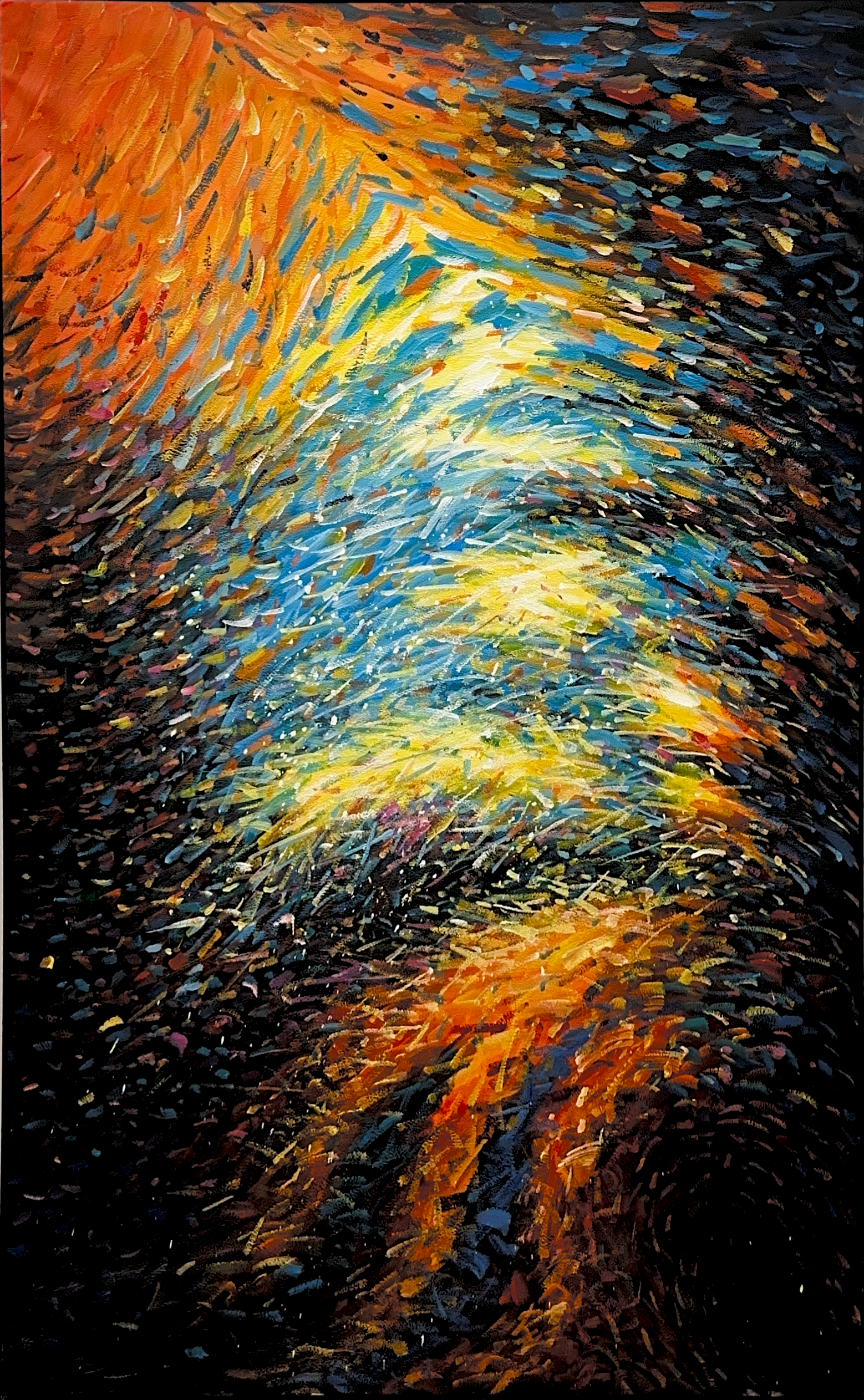 Executed in an expressive style reminiscent of Van Gogh’s energetic stroke work but infused with a distinctly contemporary palette, Whispers of Light bridges the gap between classic impressionism and modern abstract art. The warm tones radiate energy and vitality, while the cooler blues and deep blacks add balance, grounding the composition in contrast and depth. This duality creates an almost cinematic sense of drama, making the painting both visually dynamic and emotionally resonant.
