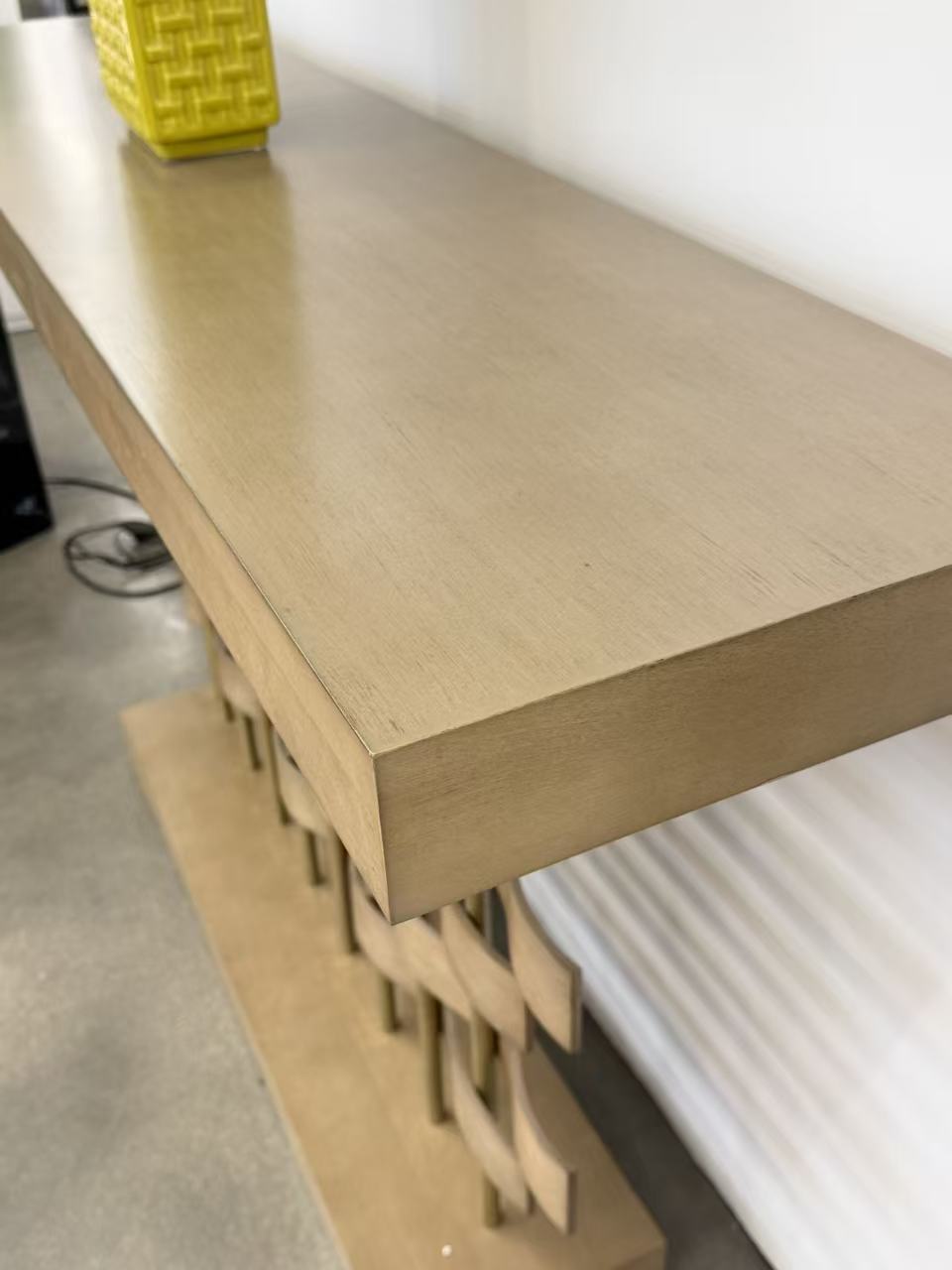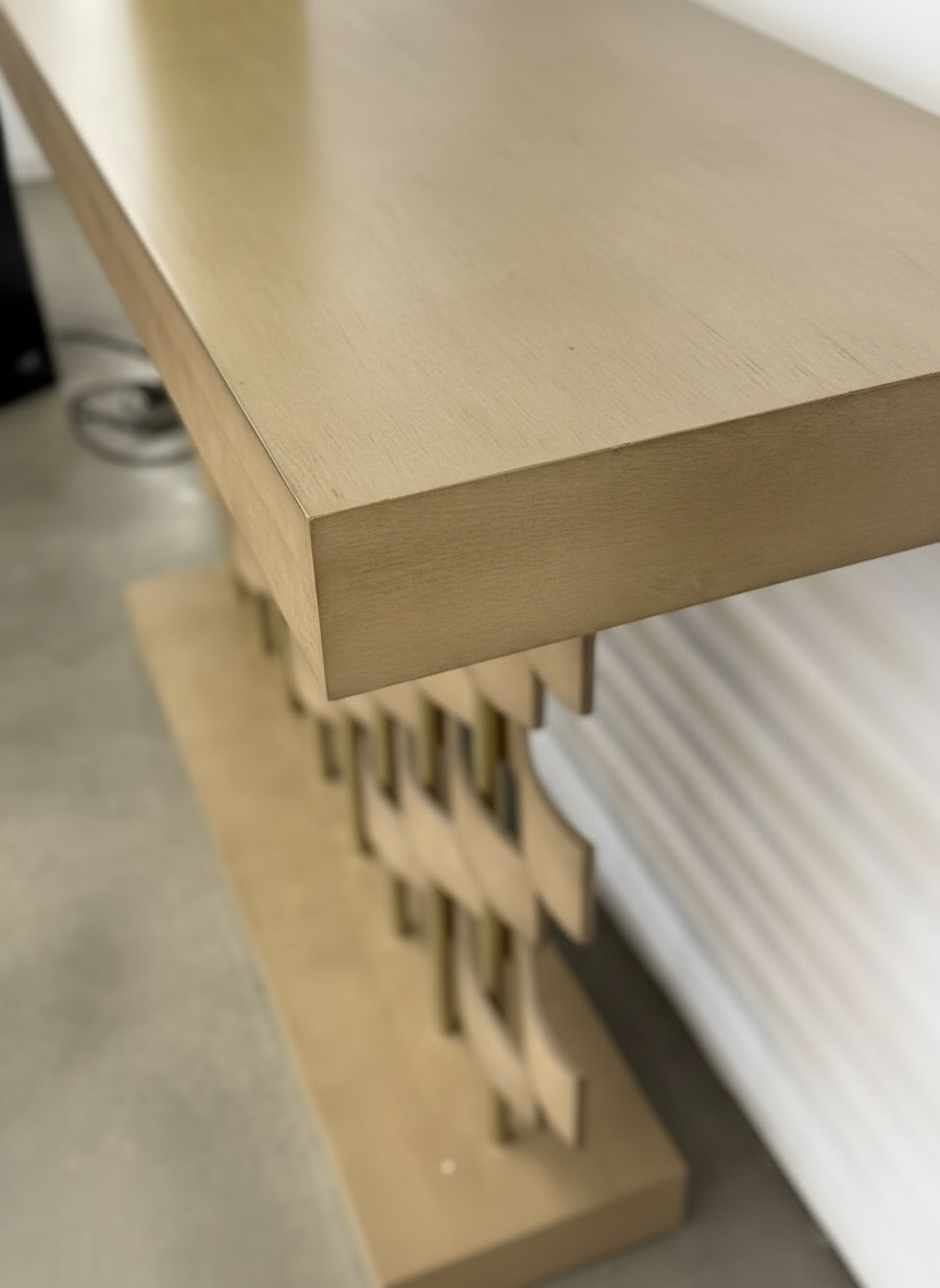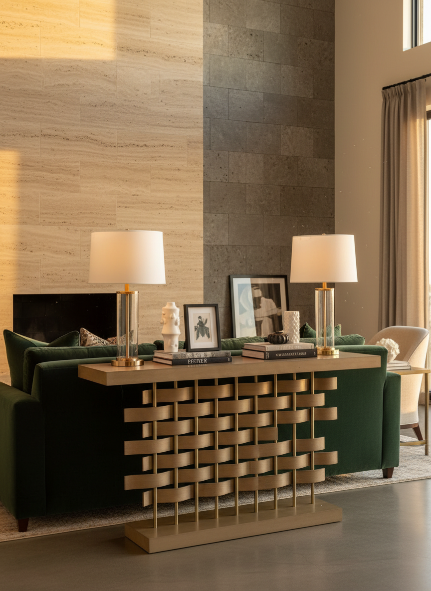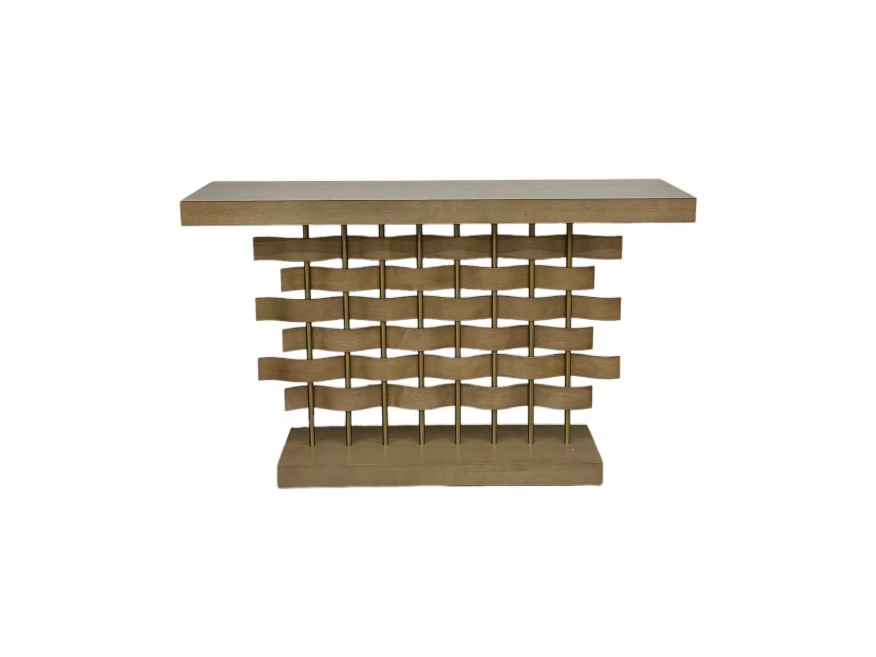 Where artisanal craftsmanship meets architectural elegance. The Woven Horizon Console is a versatile masterpiece that seamlessly transitions between entryway statement and sofa table sophistication, featuring an intricate woven texture that captures light and shadow in ever-changing patterns throughout the day.