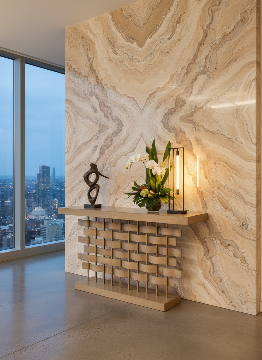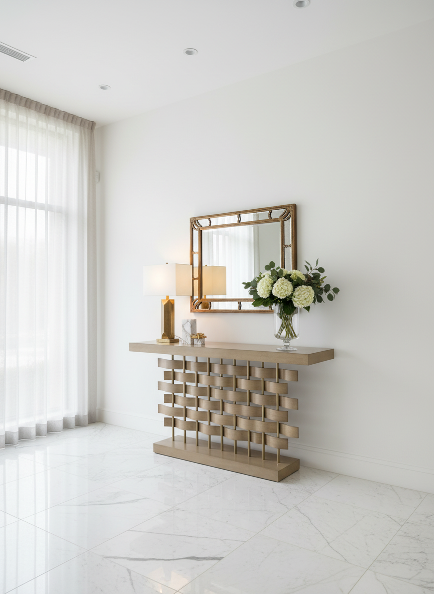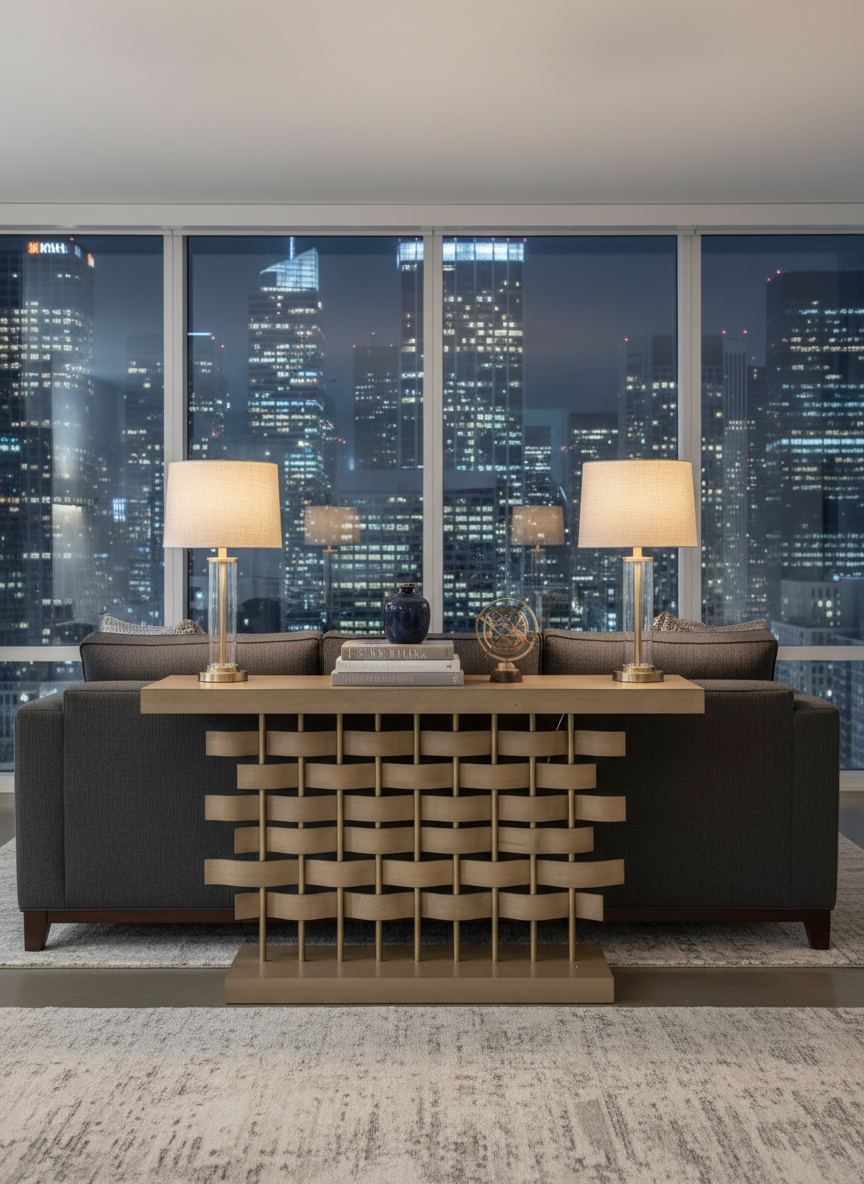 This console transcends ordinary furniture—it's a study in texture and proportion. The woven pattern creates a tactile richness that pairs beautifully with natural stone, marble, and travertine environments. Its slim profile makes it ideal for luxury condos and spacious estates alike, while the neutral palette ensures it complements both minimalist and maximalist interiors. Whether styled with museum-quality sculptures or fresh florals, the Woven Horizon Console elevates every setting with understated elegance.