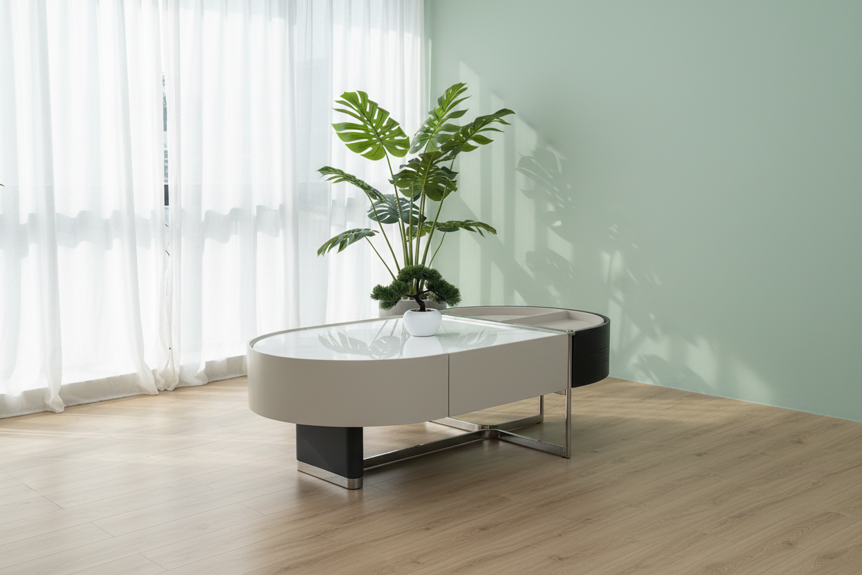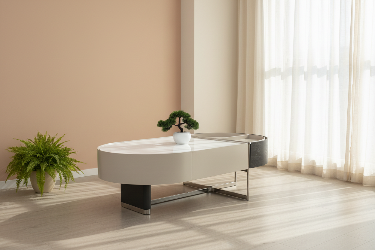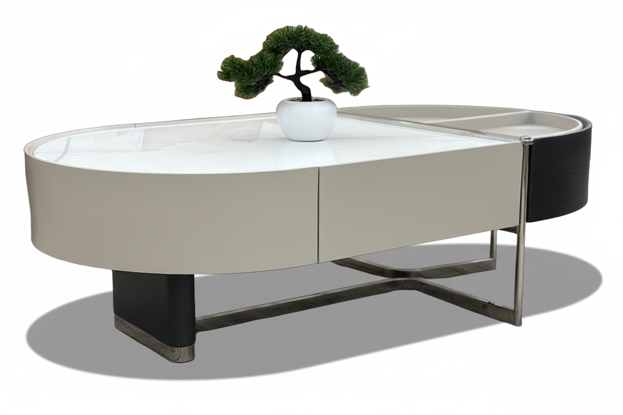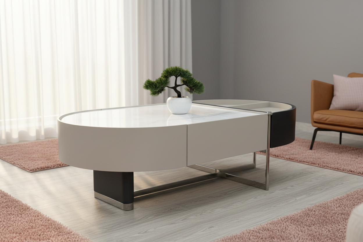 The Zen Coffee Table is a masterful blend of modern sophistication and functional design, perfect for creating a serene and stylish living space. With its asymmetrical silhouette, elegant mixed-materials, and hidden storage compartments, this table embodies a contemporary aesthetic that balances practicality with artistic expression.